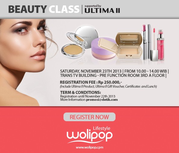 Tertarik mengikuti event ini? Sebaiknya Anda bergegas, karena kelas hanya dibuka untuk 30 peserta. Pendaftaran peserta akan berlangsung sampai 22 November 2013, dengan biaya Rp 250.000. Nantinya, beauty class Wolipop dan Ultima II akan berlangsung di Gedung Trans TV Pre Function Room Lantai 3A, hari Sabtu, 23 November 2013 mendatang dari pukul 10:00 hingga 14:00 WIB. Untuk mendaftarkan diri, silahkan klik di sini.