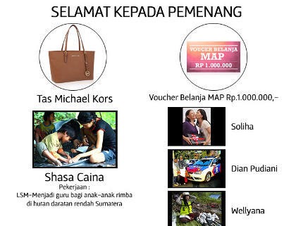 Pemenang pertama akan mendapatkan sebuah tas eksklusif dari Michael Kors dan tiga orang pemenang dengan hasil voting terbanyak akan mendapatkan voucher belanja dari MAP. Para peserta pun harus mendapatkan dukungan sebanyak-banyaknya dengan memberikan suara sebelum tanggal 19 Mei lalu.
