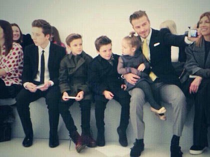 Ia beberapa kali mengambil foto selfie dengan Harper yang duduk di pangkuannya, sementara ketiga anak lelakinya duduk di samping Beckham. Pria berusia 38 tahun ini pun memasang senyum lebar di depan kamera, Romeo dan Cruz juga ikut berpose. Sementara Brooklyn menatap ke arah panggung catwalk sambil sesekali melihat kamera.
