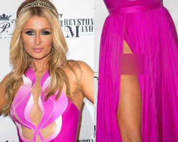 Paris mengenakan gaun panjang pink dengan belahan yang cukup tinggi, melebihi pahanya. Rupanya, ia tidak mengenakan underwear. Sehingga, saat berpose, kulit bagian intimnya terintip dari balik busananya.
