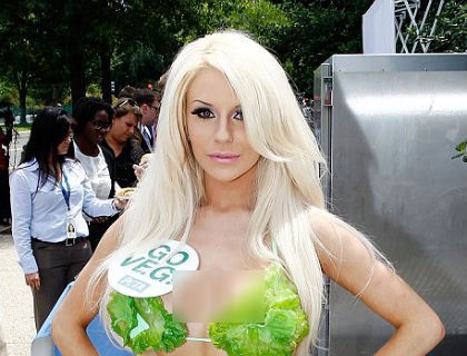 Bintang reality TV Courtney Stodden tampil vulgar saat datang ke acara Annual Congressional Veggie Dog yang diselenggarakan oleh PETA di Washington DC, Amerika, Rabu (16/7/2014). Wanita berambut blonde itu datang menggunakan bikini dari selada.