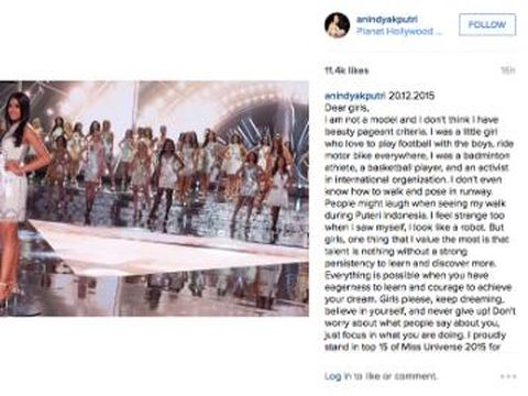 Dalam keterangan fotonya, Anindya seperti menuliskan surat dalam bahasa Inggris yang ditujukan pada para wanita. "Dear girls, I am not a model and I don't think I have beauty pageant criteria," demikian tulis mahasiswi Jurusan Perencanaan Wilayah dan Kota Universitas Diponegoro itu di akunnya @anindyakputri, Selasa (22/12/2015).