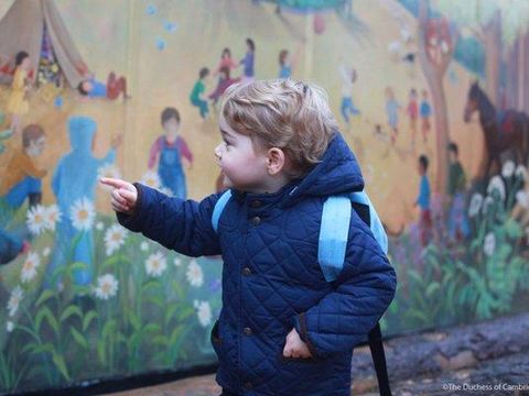 Pada foto pertama hasil jepretan sang ibu yang dirilis pihak Kensington Palace, pangeran berusia 2 tahun itu berdiri di depan tembok yang berhiaskan mural di depannya sekolahnya. Wajah dan mata George mengarah ke kamera. Rambut pirangnya terlihat sedikit beratankan tapi penampilan George tetap menggemaskan.
