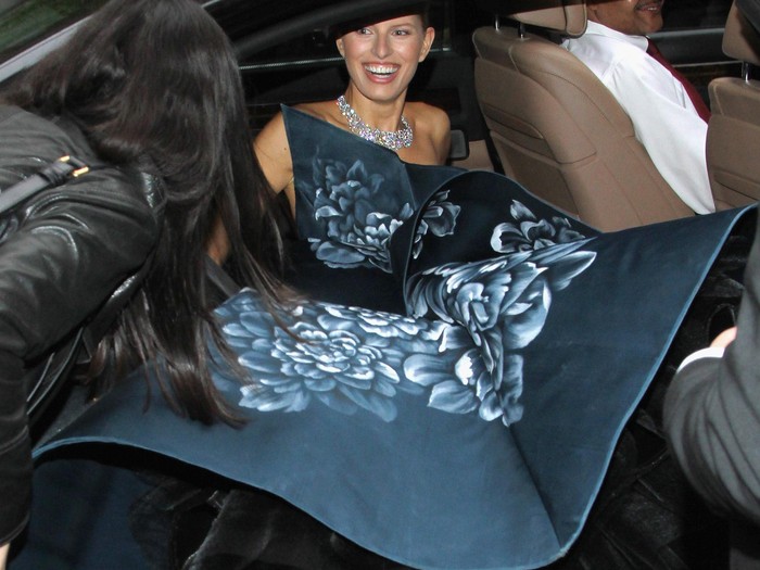 Gaun abu-abu yang berhiaskan motif floral tersebut tampil dramatis dalam siluet ball-gown yang sangat bervolume. Saking megarnya, ia sempat kesulitan masuk ke dalam mobil.