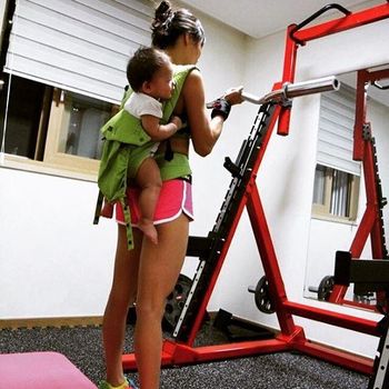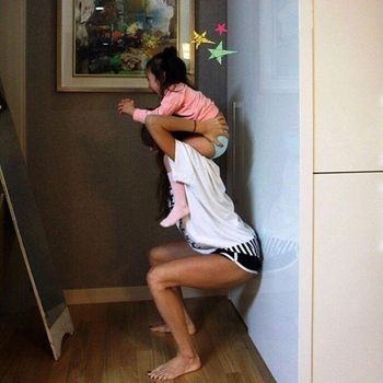Sebagai seorang ibu dari dua putri yang masih balita, Kim seringkali bermain dengan mereka sambil berolahraga. Ia menggendong putrinya di atas bahunya dan mulai melakukan squat.