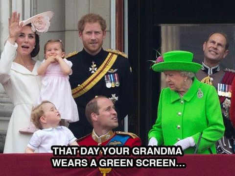Di perayaan ultahnya ke-90, Ratu Inggris dengan jabatan terlama itu memakai baju setelan warna hijau. Netizen kemudian melihatnya mirip layar hijau yang biasa dijadikan latar untuk menempatkan gambar animasi. Baju hijau itu pun lalu diedit dengan banyak gambar di atasnya. Misalnya gambar pizza, hingga cuplikan gambar pembaca berita ramalan cuaca.
