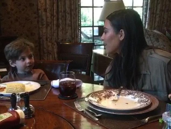 Kim mengunggah ke akun Snapchat video dirinya ketika 'diwawancara' seorang bocah laki-laki bernama Sid. Istri Kanye West tersebut tampak duduk di meja makan bersama anak dari seorang temannya itu.