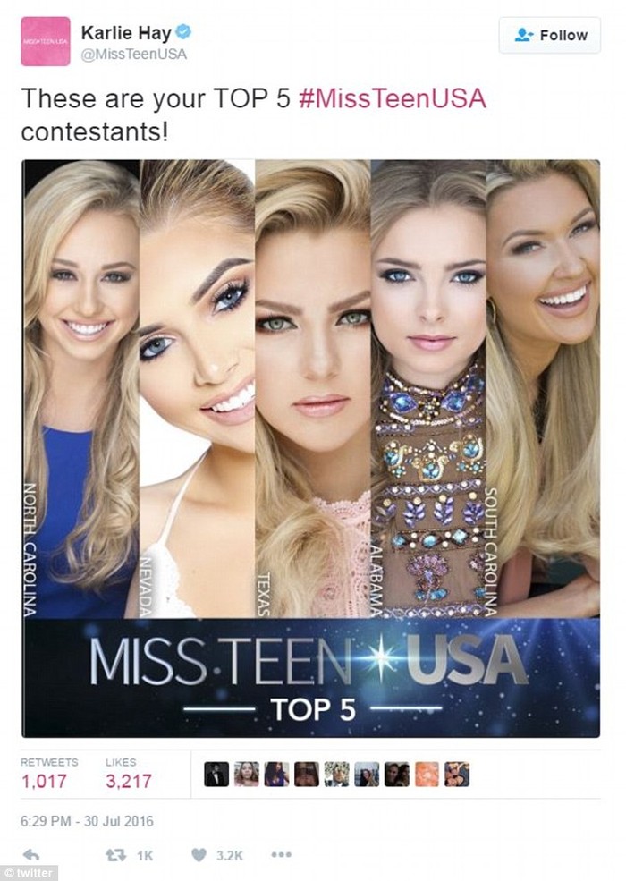 Lima kontestan Miss Teen USA 2016 yang masuk ke lima besar kontes kecantikan tersebut adalah Karlie Hay, Emily Wakeman, Marley Stokes, Erin Snow and Carissa Morrow. Jika dilihat dari fotonya memang mereka memiliki kemiripan. Mereka semua sama-sama memiliki rambut pirang yang panjang dan bermata biru. Riasan yang diterapkan pada kelimanya pun hampir serupa, dengan pulasan lipstik berwarna pink.