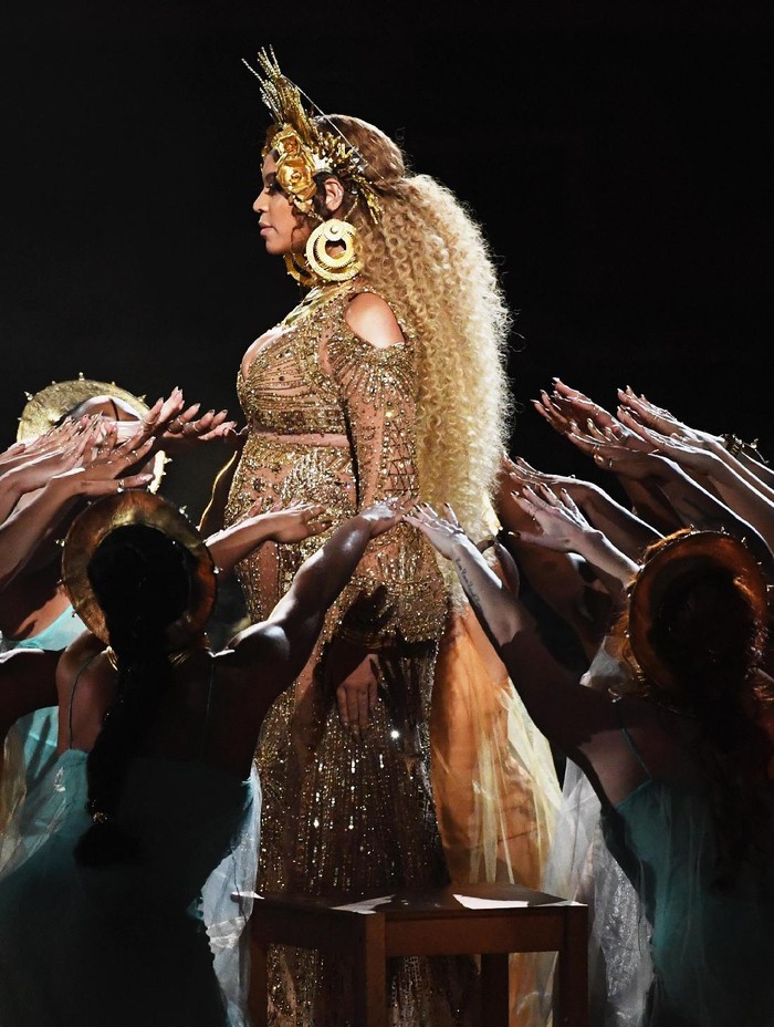 Beyonce muncul di atas panggung bak seorang dewi dalam balutan gaun emas rancangan Peter Dundas, mantan direktur kreatif rumah mode Roberto Cavalli.
