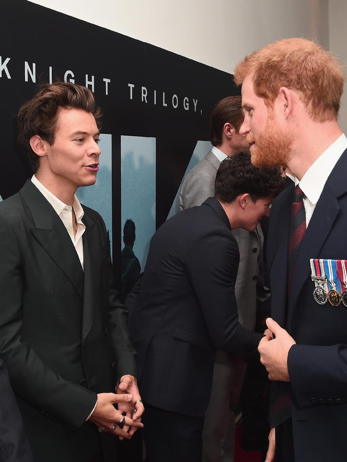 Keduanya sama-sama tampan dalam balutan jas formal. Harry Styles dan Pangeran Harry tampak akrab mengobrol. Namun saat itu Pangeran Harry datang sendiri tanpa ditemani kekasihnya, aktris Meghan Markle.