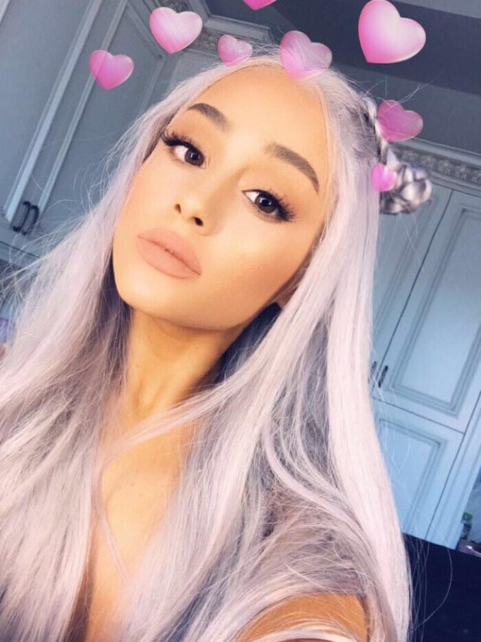 Dalam Instagramnya, Ariana memamerkan rambut panjang digerai dengan warna silver keunguan. Meski terlihat seperti rambut asli, tapi tampaknya hari itu ia tengah menggunakan wig.