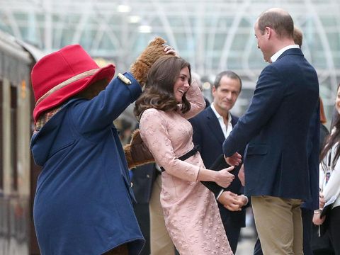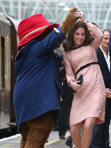 Di kehamilan ketiganya, Kate Middleton menari bersama badut Paddington Bear di stasiun. Ia tampak menikmati momen dansa dengan Beruang Paddington, sementara Pangeran William hanya tersenyum-senyum melihat aksi mereka.