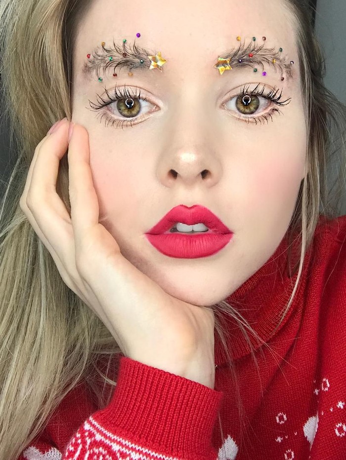 Alis dibuat on-fleek, ditabur dengan bubuk shimmer kemudian bagian bawah tulang alis dihiasi dengan hiasan batu-batu kecil warna-warni. Belum lagi eyeshadow yang dibuat meriah semakin memperkuat kesan Natal.