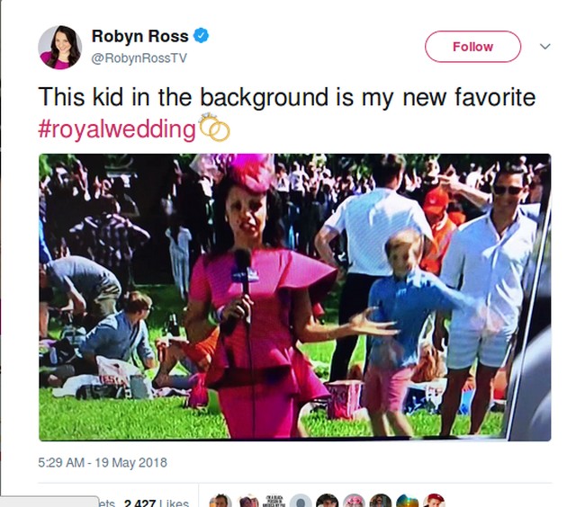 Pernikahan Pangeran Harry diberitakan oleh dunia. Ada momen lucu dalam salah satu pemberitaan yakni reaksi seorang anak kecil saat seorang reporter melaporkan acara pernikahan. Ia terlihat menari di belakang sang reporter ketika mengetahui dirinya muncul di televisi.