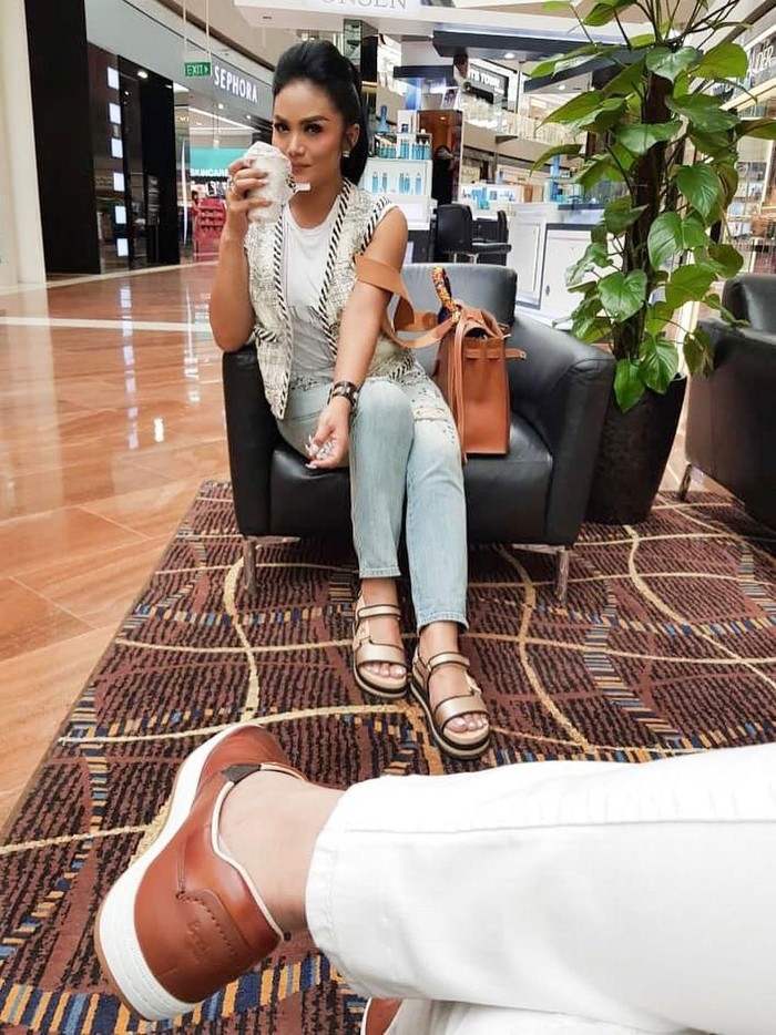 Pada foto yang diunggahnya itu KD tampak memakai celana denim yang dipadukan dengan kaus dan rompi. Kakinya tampak dibalut sepatu sandal. Tas Hermes Kelly berwarna cokelat miliknya juga tampak menemaninya.