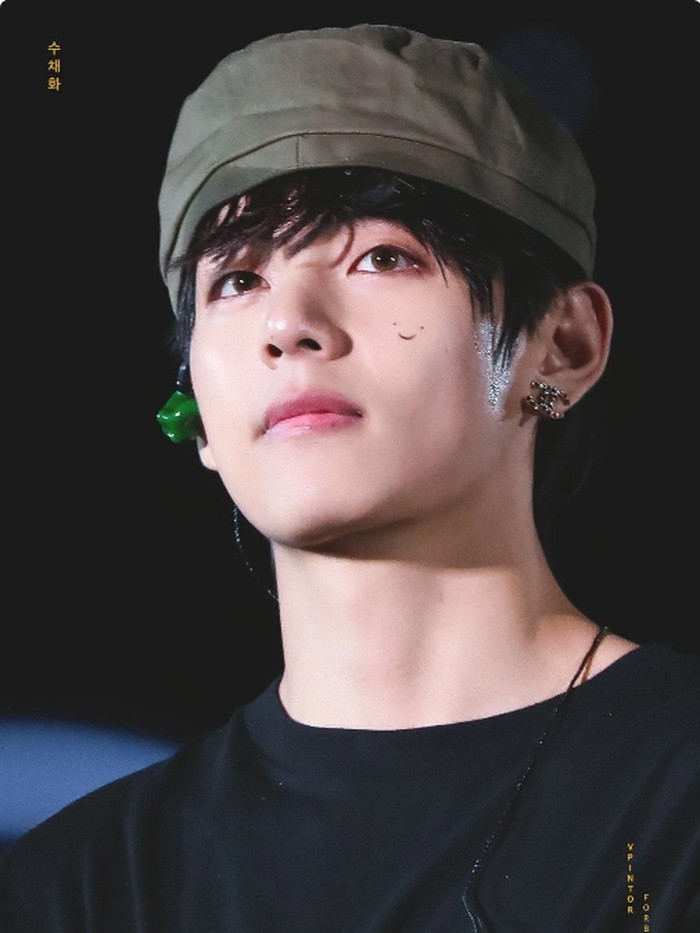 Dalam sejumlah foto, wajah V tampak dihiasi coretan bergambar wajah senyum. Dikatakan jika awalnya vokalis tersebut sengaja menutupi jerawat kecilnya dengan mencorekan titik. Kebetulan titik itu pun sejajar dengan tahi lalatnya sehingga terlihat seperti dua pasang mata.