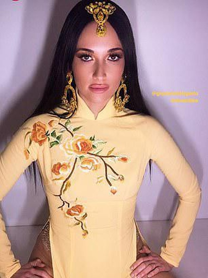Kacey mengunggah penampilan seksinya tersebut di Instagramnya. Terlihat ia mengenakan ao dai atau baju nasional Vietnam. Ao dai yang memiliki belahan tinggi seharusnya dipadankan dengan celana yang disebut pantalon.