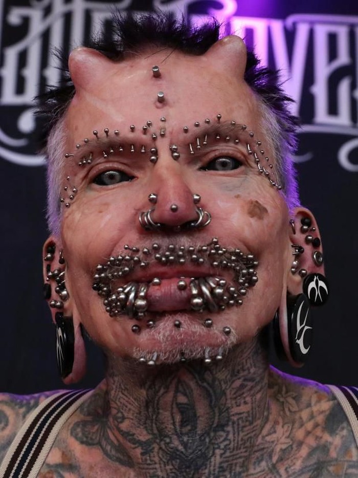 Pria ini dijuluki sebagai manusia paling banyak tindikan sedunia. Pria bernama Rolf Buchholz pun memiliki bentuk kepala yang tak wajar yakni memiliki tanduk.