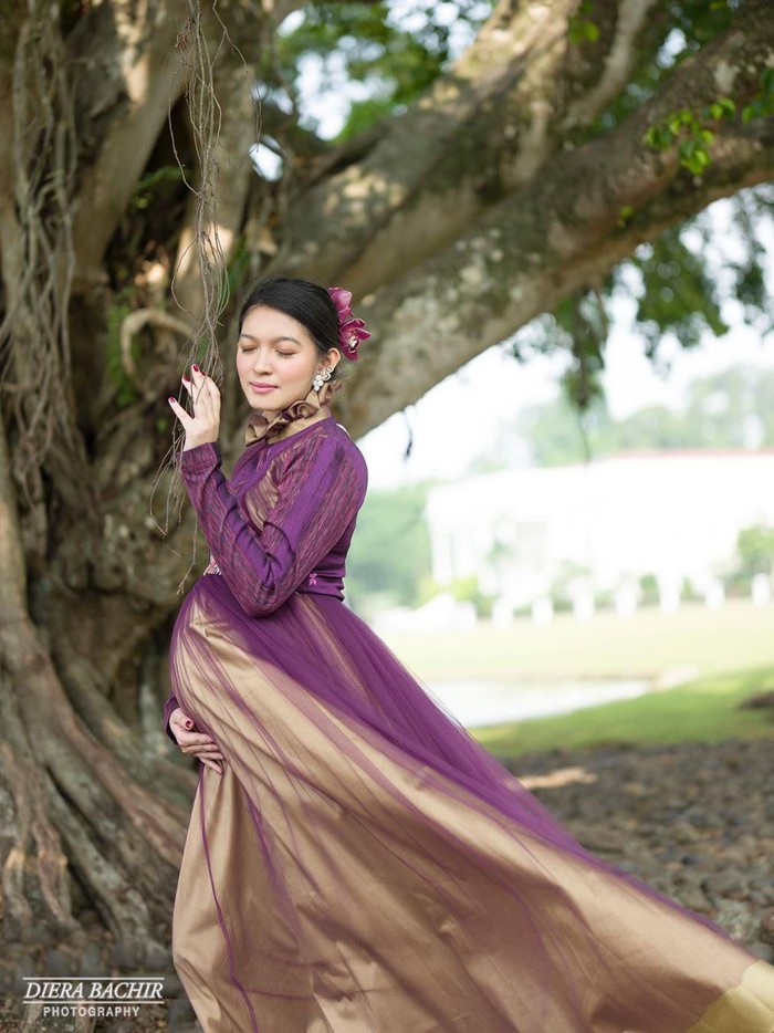 Fotografer Diera Bachir mengunggah foto hamil Selvi Ananda yang anggun mengenakan busana rancangan dari Tuty Adib. Selvi memakai dress dengan aksen turtle neck warna gold yang dihiasi kain tulle warna ungu.