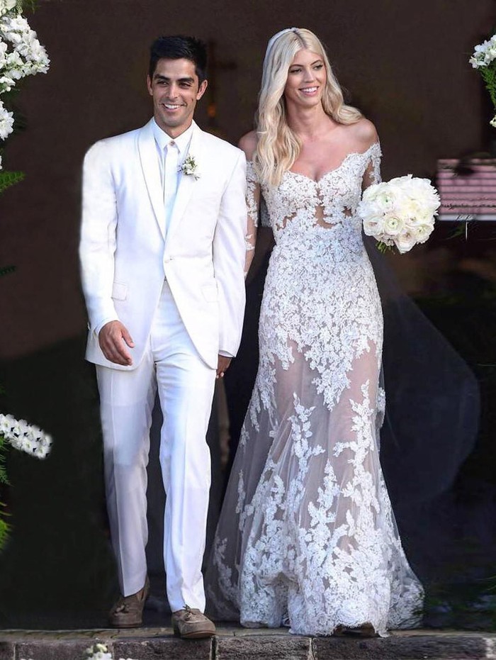 Gaun indahnya tersebut dirancang oleh desainer Zuhair Murad. Gaun lace Devon berpotongan off-shoulder, dan semakin dramatis dengan menggunakan veil panjang.