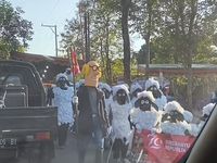 Ia menjelaskan bahwa kostum nyeleneh yang dikenakan para peserta dibuat dari bahan sederhana, seperti plastik dan tali rafia. "Kebetulan saya juga salah satu pesertanya, kak. Itu semua dari bahan plastik dan tali rafia. Persiapan bikin kostumnya cuma dua hari, tapi untuk latihan dan persiapan gerak jalannya sekitar semingguan," tambah Ovy.