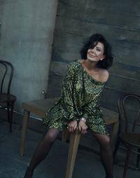 Sang bintang utama, Kris Jenner, tampil glamor dalam balutan gaun merah strapless dengan rok mengembang dan hiasan rumbai berlapis. Rambut gelapnya disanggul rapi, memperlihatkan anting menjuntai yang berkilau. Ia melengkapi penampilannya dengan sarung tangan hitam panjang bergaya opera.