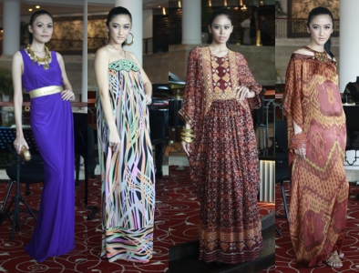 Ghea Panggabean masih menggunakan kain jumputan asal Palembang. Ia juga banyak menggunakan teknik draperi dan lipit. Seperti ingin memberikan opsi lain, Ghea pun menambahkan variasi busana dengan potongan sabrina dan aplikasi bebatuan pada leher. (eya/fer)