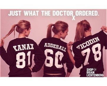 Salah satu butik paling populer di Los Angeles, Kitson LA tengah menuai kontroversi karena menjual busana bertuliskan nama obat-obatan anti depresan seperti Adderall, Vicodin dan Xanax. Meski dibuat dengan tujuan parodi dan seni, namun banyak pula yang tersinggung dan merasa desain ini tidaklah pantas.