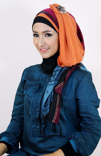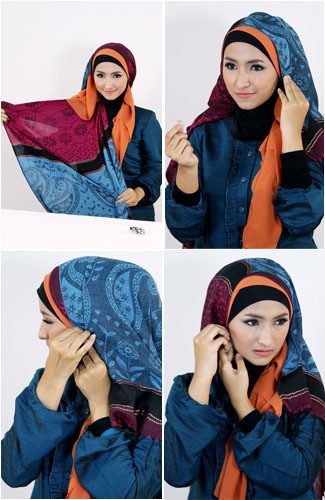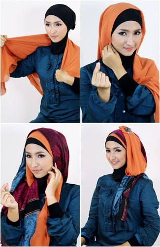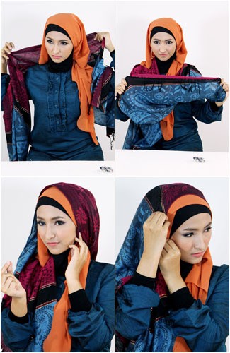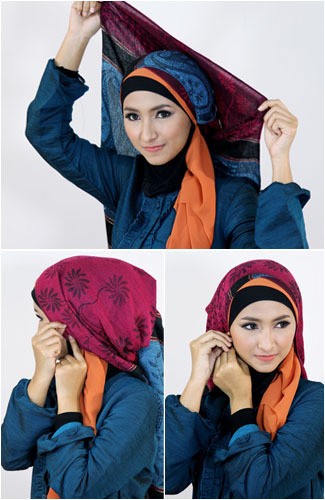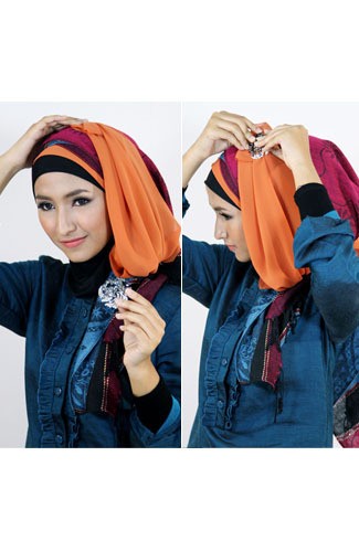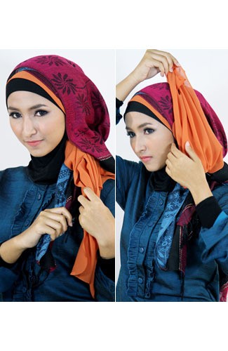 2. Silangkan sisi kiri jilbab ke kanan atas