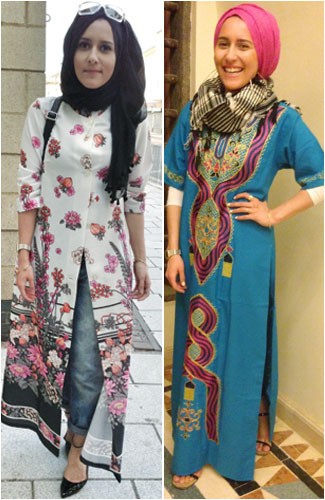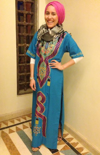 Wanita yang juga berprofesi sebagai stylist ini memang lebih suka dengan gaya berhijab yang bersifat timeless. Tapi sesekali iapun keluar dari gaya khasnya. Kali ini Dina mengaplikasikan maxi dress dengan sentuhan tradisional egypt, dengan syal berwarna gelap dan turban pink mencolok.