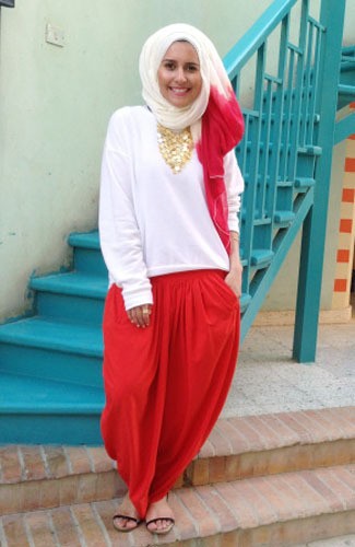 Celana merah berpotongan lebar dengan blouse putih polos, menjadi terlihat lebih stylish ketika Dina memadukannya dengan kerudung berwarna serupa. Iapun mengenakan kalung mewah berpalet gold sebagai pelengkap penampilan.
