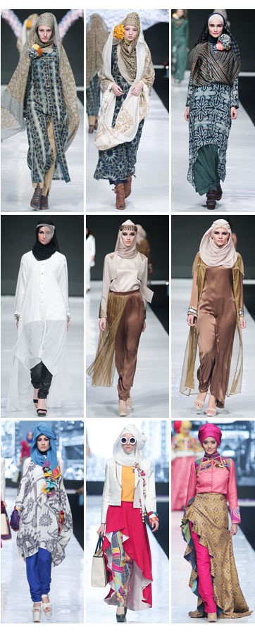 Sebelum koleksi yang terkesan berat dari Dian dan Jenahara, desainer Windri Dhari juga ikut menampilkan karya moslem wear lewat label Nur Zahra. Karya Bur Zahra lebih kasual dari material ringan.