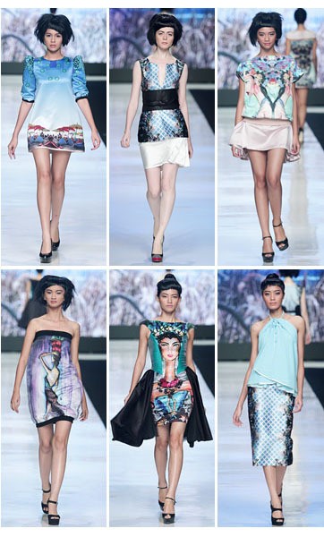 Setelah palet putih, barulah sang desainer menyajikan berbagai teknik digital printing. Misalnya dalam terusan mini bersiluet A line dengan efek printing mirror pada kain ringan seperti satin silk. Ada juga beberapa busana yang seolah terbuat dari lukisan, menggambarkan wajah seorang wanita Bali sedang membawa buah di atas kepala, atau penuh bunga di kepalanya. Lukisan-lukisan tadi adalah sejumlah gambar yang memang ia ciptakan sendiri. Beberapa efek printing tersebut dijadikan rok midi, blouse ataupun dress bersiluet longgar.