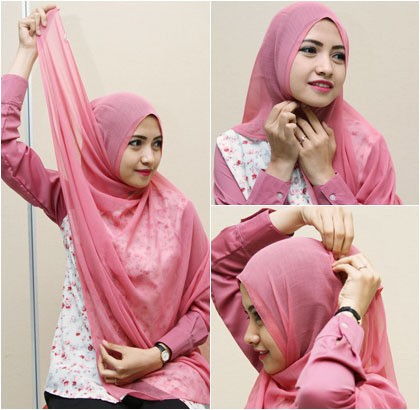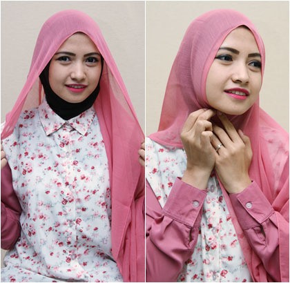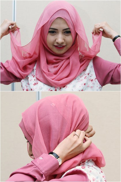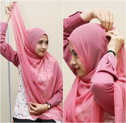 Siapkan scarf segiempat sesuai dengan warna busana Anda. Lebarkan scarf kemudian letakkan di atas kepala. Bagian kiri lebih pendek dari sisi kanan. Ambil jarum pentul lalu sematkan di bawah dagu.