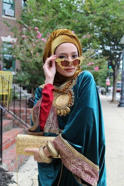Untuk pemotretan, pertama saya mengenakan baju berbahan velvet berwarna tosca dengan aksen gold di bagian leher, dan aksen tenun marun di bagian lengan bawah. Penampilan saya dipercantik dengan berbagai aksesori mulai dari gelang, kalung, cincin, clutch, hingga kacamata. Pemotretan pertama ini dilakukan di Lincoln Memorial.