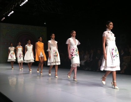 Dari koleksi Ghea Panggabean misalnya, kesan oriental dan gabungannya tradisi Indonesia kental terasa dalam dominasi warna merah. Busana dibentuk dalam siluet kebaya dan kain dalam warna merah marun, yang diberi sentuhan oriental lewat aplikasi bordir emas berbentuk burung phoenix.