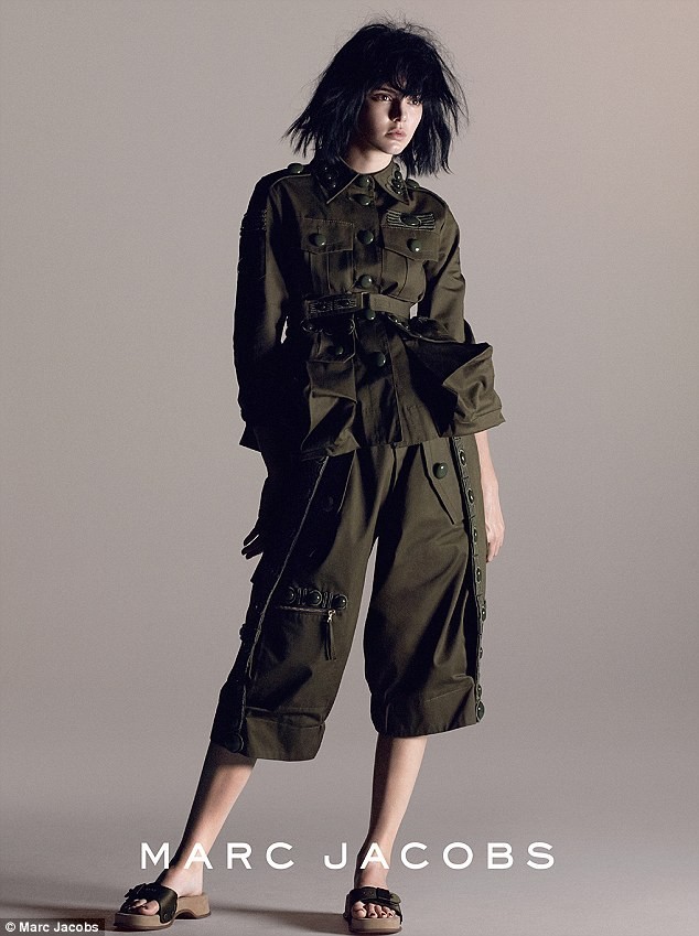 Model 19 tahun itu mengenakan koleksi bergaya militer dari tren yang disuguhkan Marc Jacobs bulan September 2014 lalu di New York. Sama seperti tampilan di runway, para model kampanye 2015 ini juga mengenakan rambut bob palsu dan wajah 'tanpa make-up' yang dibuat oleh make-up artist, Diane Kendal.