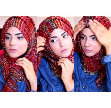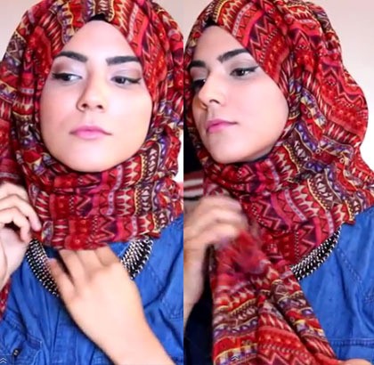 Pegang bagian tengah scarf di bawah dagu dengan tangan kiri. Lalu putar bagian yang kanan melalui depan dada ke atas kepala. Lilitan tidak melebihi kalung yang Anda pakai. Tarik ciput sedikit ke arah depan lalu rapikan.
