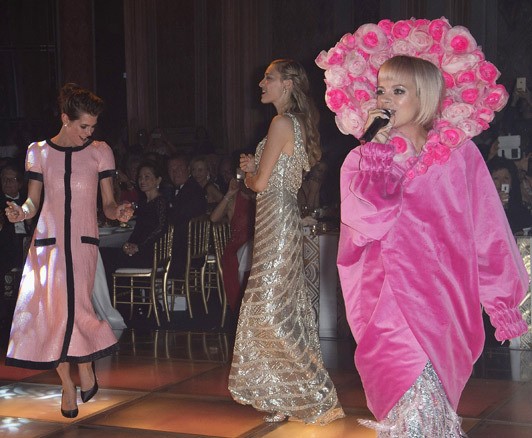 Seolah mau mengikuti tema tempat acara berlangsung, Lily Allen mengenakan kostum velvet pink dengan kerah super lebar dan bagian bawahnya seperti rumbai metalik. Di bagian kerah juga dihiasi kelopak-kelopak mawar yang juga dijahit tangan.