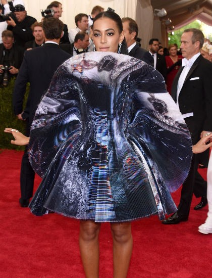 Met Gala 2015 ini, Solange kembali menuai drama. Namun kali ini, bukan drama perkelahian, melainkan busananya yang dramatis sehingga menjadi bahan perbincangan di dunia fashion dan media sosial.