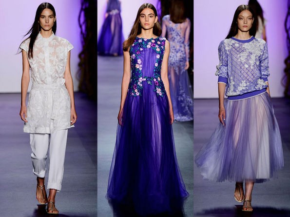 Garis feminin juga ditampilkan dalam koleksi Tadashi Shoji dalam inspirasi bunga ala Jepang, gaun kaya detail bordir berwarna violet serta rok-rok lipit yang terlihat ringan dalam bahan syifon.