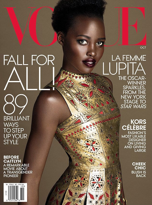Dalam balutan gaun Valentino berbahan emas, Lupita Nyong'o tampil bersinar di cover majalah Vogue terbaru yang rilis Selasa (22/9/2015) mendatang. Seperti biasa, pemenang Oscar ini menggambarkan definisi kecantikan yang berbeda lewat kulitnya yang sehat dan busana high-fashion.