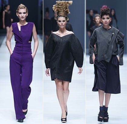 Tidak hanya jaket, detail tersebut juga mewarnai hampir seluruh busana yang ditampilkan. Muncul variasi maxi dress, jumpsuit, dan kamisol yang bergaya asimetris dengan sentuhan cut-out yang dibuat bertumpuk seperti air terjun dalam sapuan warna hitam, putih, dan ungu tua.