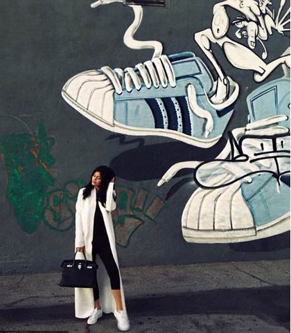 Kekasih dari rapper Tyga ini tak hanya membuat statement fashion dari tasnya, namun juga busana. Bintang realiti itu tampil dalam balutan long coat putih di atas baju serba hitam di dalamnya. Sneakers putih membaurkan keseluruhan penampilan ini.