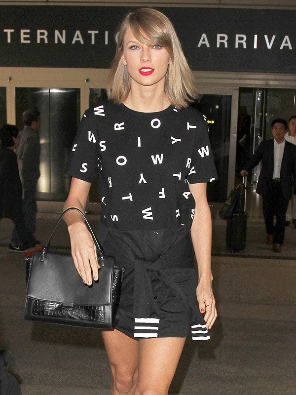 Dalam penampilan terbarunya, Taylor Swift tampil dengan shirt dress bertuliskan namanya dengan huruf acak: TAYLOR SWIFT. T-shirt yang menyambung dengan rok dan bagian lengan jaket ini adalah koleksi rancangannya sendiri untuk retailer bernama Heritage66.
