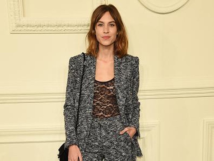 Begini cara Alexa Chung memadukan garis maskulin dan sisi feminin dalam satu waktu. Pilihannya jatuh pada atasan lace seksi yang menerawang sebagai dalaman dari setelan blazer dan celana flare klasik berpotongan tegas.
