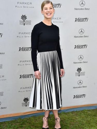 Sweater dan rok midi selalu menjadi padanan kasual yang cantik untuk Anda yang sedang malas berdandan. Agar tampilan terlihat berbeda, pilih rok dengan aksen lipit atau motif seperti gaya Rosamund Pike, dan tambahkan heels favorit untuk menyempurnakannya.