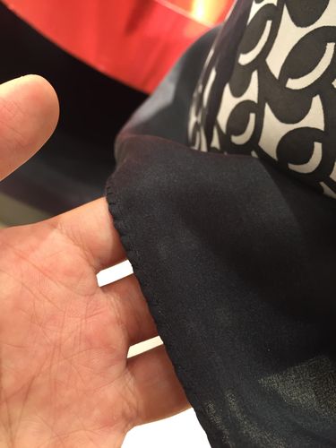 "Bagian pinggirnya dilinting pakai tangan. Bentuk lintingannya sangat kecil, halus banget. Beda dari lintingan scarf Hermes yang besar-besar. Mungkin karena dibuat di Italia, tangan perajinnya besar-besar," kata Ari.