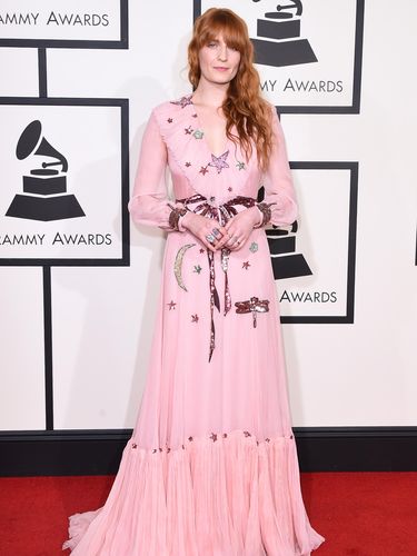 Hadir sebagai nomine Grammy Awards, pentolan band Florence + Machine ini mengenakan gaun pink Gucci bergaya vintage. Gaun dengan kerah ruffle itu dihiasi motif bintang dan bulan manik-manik yang menginjeksikan kesan jenaka pada gaya wanita Inggris ini.