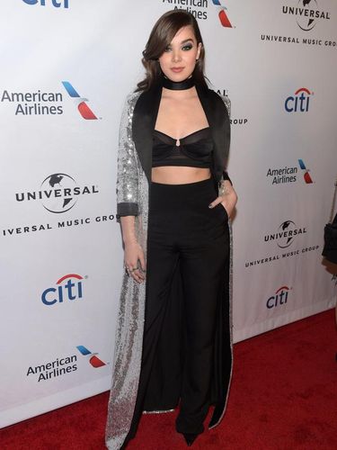 Hailee Steinfeld terlihat lebih dewasa dengan pulasan smokey eye yang cukup berat. Penampilannya diimbangi dengan bralet dan celana high-waisted hitam klasik, juga outer penuh kilau sequin untuk memberi kesan modern.